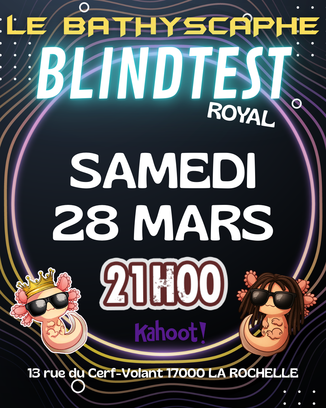 Le Bathyscaphe 13 rue du Cerf-Volant, LA ROCHELLE, Nouvelle-Aquitaine, FranceSamedi 28 Mars, c’est 🎤🎶 BLINDTEST Royal 🎶🎤 dans votre sous marin ! Alors prenez vos plus beaux smartphones chargés à 100% et installez l'application KAHOOT qui permettra de répondre aux […]