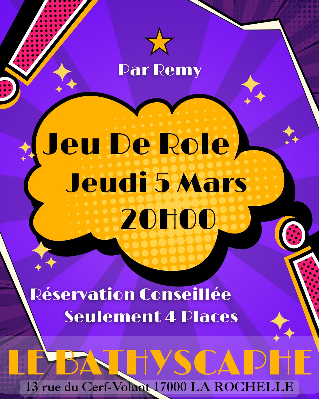 Le Bathyscaphe 13 rue du Cerf-Volant, LA ROCHELLE, Nouvelle-Aquitaine, FranceImaginez : c’est Vendredi soir, le 20 Mars et il est 21h. Vous poussez la porte du Bathyscaphe. Un verre vous attend, vos potes aussi. Et sur scène, GRAOW balance […]