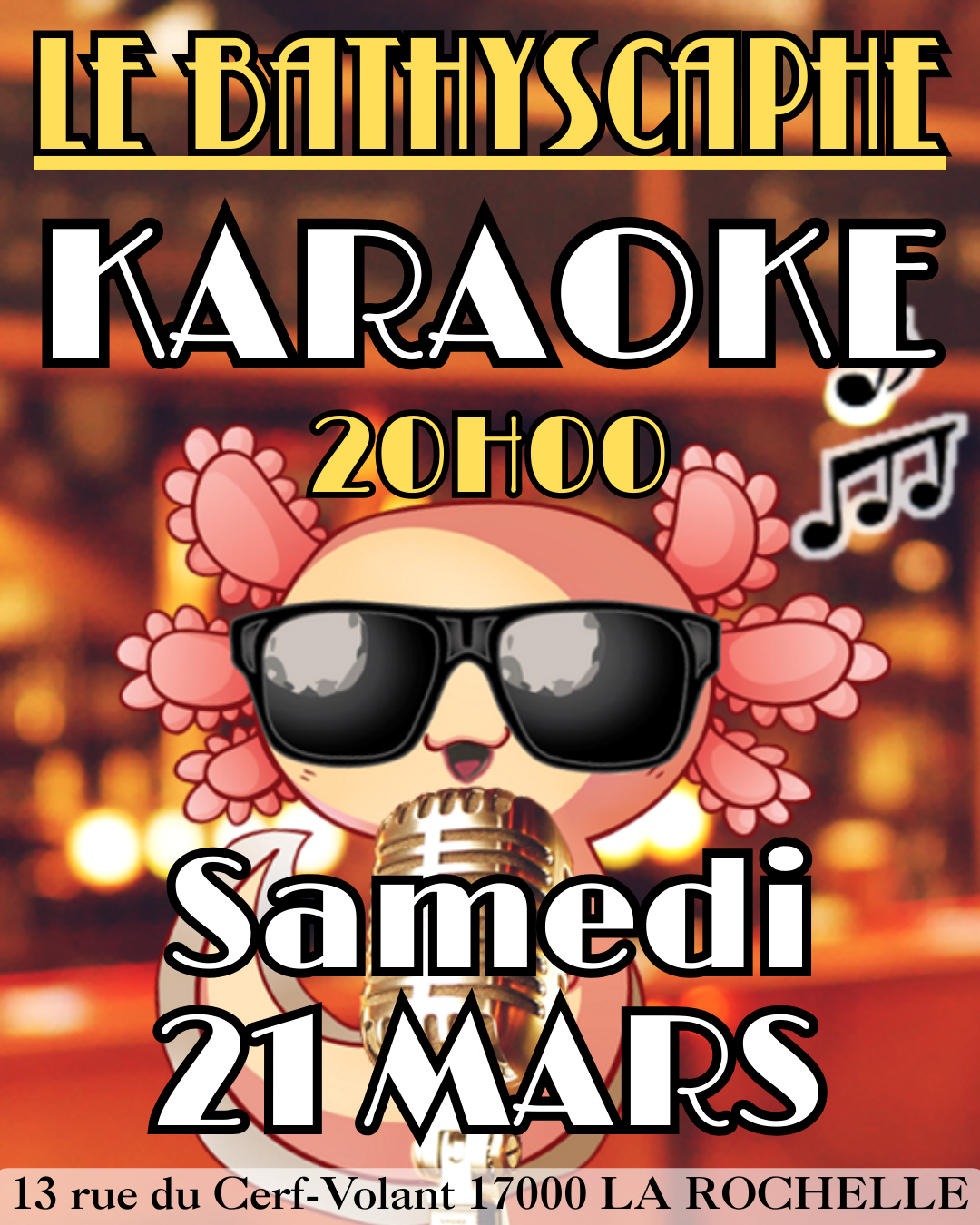 Le Bathyscaphe 13 rue du Cerf-Volant, LA ROCHELLE, Nouvelle-Aquitaine, France🎤 KARAOKÉ DU BATHYSCAPHE 🎤 À 20h : « je chante pas ».À 21h : « bon d’accord juste une ».À 22h : tu es la star que tu mérites. […]